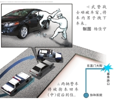 知情人透露,那輛本田車被搶后,該車司機立即撥打110報警,北京警方隨即向附近所有執(zhí)勤的民警、武警、警車發(fā)出圍堵命令,在全城范圍內(nèi)堵截這輛黑色本田車。上午10點,一輛武警巡邏車和一輛110巡邏車按布控指令行駛到東直門內(nèi)大街時,發(fā)現(xiàn)了正在瘋狂逃竄的本田車,兩輛巡邏車立即鳴響警笛一路追去,并最終將本田車別住,抓獲犯罪嫌疑人。