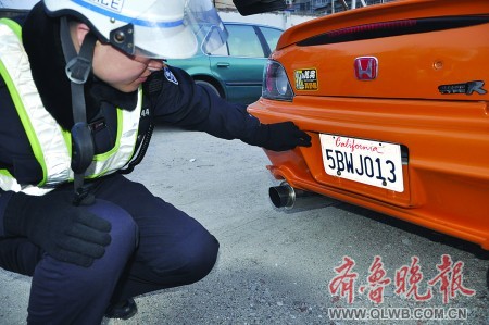 17日下午,煙臺市交警一大隊(duì)交警在南大街路段巡查時(shí),查住一輛雷人的老款本田轎跑車,該車車牌寫的全是外文。據(jù)駕駛員本人講,這副車牌是美國加利福尼亞州的車牌,他覺得洋車牌新鮮、氣派,便找別人弄到一副作廢的掛上了。交警表示,這種做法顯然是違法的,車主將面臨處罰。(記者 張琪 通訊員 趙亞林 溫全福 攝)