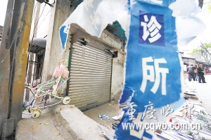 昨日,記者在現(xiàn)場看到,王氏診所位于前驅路公路邊一棟民房的底樓。診所卷簾門緊閉,在一張撕得零碎不堪的藍色布條上,寫著“王氏按摩診所”、“推拿、按摩”等字樣。