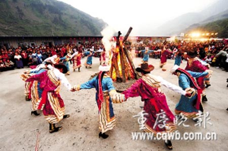 戰(zhàn)勝了地震、恢復(fù)了重建,昨天,四川省汶川縣映秀鎮(zhèn),人們點(diǎn)燃篝火,跳起“鍋莊”,迎接“五一”。