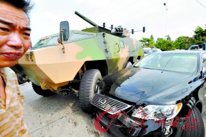 昨天下午2時(shí)30分,在107國(guó)道新塘路口經(jīng)典酒店門(mén)口處,一輛輪式裝甲車(chē)與一輛價(jià)值百萬(wàn)元的凌志轎車(chē)相撞。車(chē)禍造成該路段的擁堵。同時(shí),另外一輛轎車(chē)和一輛大貨車(chē)行經(jīng)此處因避讓不及也撞上了。
