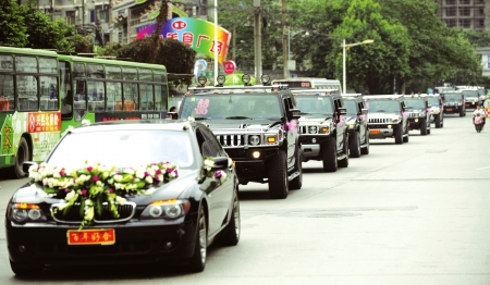 奔馳越野車作為拍攝車,主婚車是一輛寶馬7系轎車,后面跟著的則是12輛扎著粉色氣球的悍馬H2……昨日上午,這支婚車隊伍在成都合江亭一亮相,立即引起眾人的驚嘆,市民紛紛掏出手機(jī)和相機(jī)拍照。有人算了一筆賬,這支豪華婚車隊伍的車輛價值上千萬元,實屬難得。