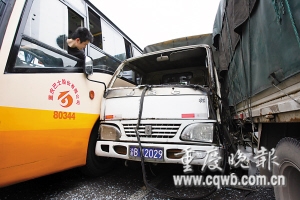 昨下午1點(diǎn)半,記者在事發(fā)地雙碑石井坡車站紅綠燈處看到,一輛長(zhǎng)安小貨車卡在805路公交車和另一輛貨車之間。長(zhǎng)安小貨車車體嚴(yán)重變形,擋風(fēng)玻璃全部被撞爛,碎玻璃撒了一地。公交車和另一輛貨車,車身上都有重重的擦損痕跡。
