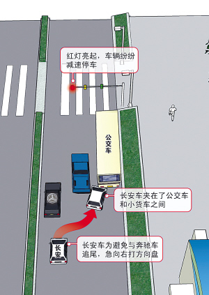 一輛剎車失靈的長(zhǎng)安小貨車眼見追尾不可避免,當(dāng)機(jī)立斷——猛打方向盤避開正前方的奔馳,而撞向了另一車道的公交車。