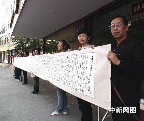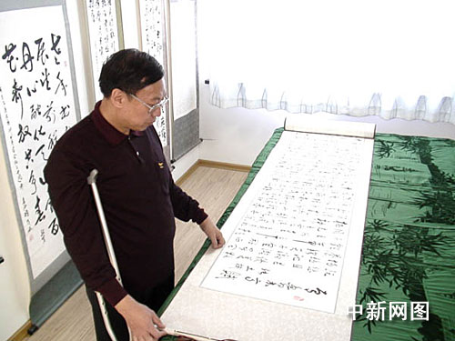 中新網(wǎng)烏魯木齊9月24日電(王小軍)新疆烏魯木齊一殘疾人身殘志堅(jiān),閑暇之余,拿起手中的畫筆,書寫下一幅13米長(zhǎng)卷,獻(xiàn)給新中國(guó)成立六十周年。