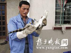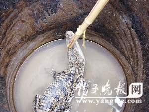 昨天上午,記者接到市民董先生的報料來到了江寧谷里孝義村111號,周國喜正蹲在一個大缸前,旁邊還有幾位村民在指指點點。記者走近一看,只見一只長約80厘米的小鱷魚正在缸底,頭部往上翹,尾部不停地甩動,看上去很緊張。盡管這條小鱷魚給周國喜帶來了不小的損失,可他沒有絲毫的恨意,反倒細(xì)心照顧起來!斑@個魚塘我一直在養(yǎng)魚,每年2月份和6月份都投放一次魚苗,總共1萬多條,鳊魚、鯽魚都有。”周國喜說,可讓他奇怪的是,產(chǎn)量都不高。周國喜曾研究過多次,可沒有任何結(jié)果,這讓他百思不得其解。可就在今年8月份的時候,周國喜在清理魚塘?xí)r,突然發(fā)現(xiàn)一只小怪物伸出了頭,嘴巴長又尖!熬褪撬耍耶(dāng)時確定魚塘產(chǎn)量不高就是因為這只小怪獸!敝車哺嬖V記者,他自此開始盯著魚塘,可小怪獸很警惕,大都在魚塘底,很難發(fā)現(xiàn)。功夫不負(fù)有心人,通過近半個月的觀察,周國喜發(fā)現(xiàn)小怪獸喜歡上岸睡覺,不過是在對岸的水花生上面,很難捕捉!拔舶秃荛L,嘴很尖,身上顏色黃黑相間!敝車舱f第一眼看到小怪獸就覺得像是鱷魚,不過他不敢確認(rèn),于是喊來了弟弟,結(jié)果弟弟覺得像是國家一級保護(hù)動物揚子鱷。