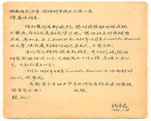 隨后,譚暑生每當(dāng)在學(xué)術(shù)研究過程中有什么新的進(jìn)展,或者遇到什么困惑,他都會(huì)寫信給錢學(xué)森,而錢學(xué)森基本上也會(huì)每信必回。為了讓譚暑生能潛心于科學(xué)研究工作,錢學(xué)森還多次給國防科大領(lǐng)導(dǎo)寫信,說“譚暑生的研究室做理論工作,大概花不了什么錢,應(yīng)該下決心干!