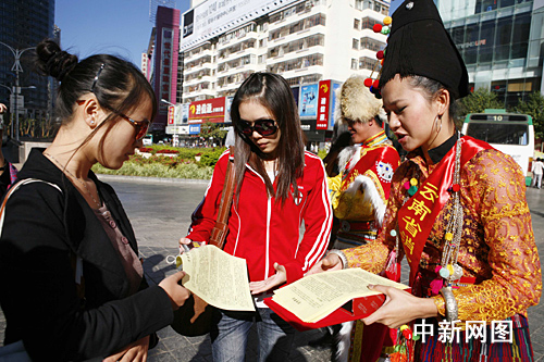在今日舉行的宣傳活動上,記者見到了這二十六位“消防形象大使”。他們身著傳統(tǒng)民族服裝,向市民發(fā)放消防安全知識手冊,并現(xiàn)場為市民講解消防知識。據(jù)稱,他們回到自己家鄉(xiāng)后,還將繼續(xù)當?shù)仄稹跋佬蜗蟠笫埂钡穆氊,向云南少?shù)民族地區(qū),特別是邊遠的地區(qū)宣傳消防知識。