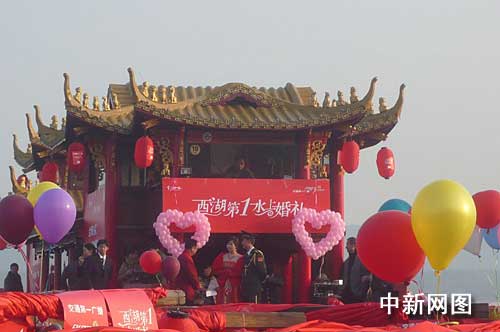中新網杭州11月22日電(記者 柴燕菲 實習生 倪幼杰)今天下午,西湖上舉行了一場獨特而浪漫的水上婚禮。這是在西湖上迎來的第一對新人。更為特殊的是,婚禮的新郎是剛剛參加了國慶六十周年閱兵的戰(zhàn)士。