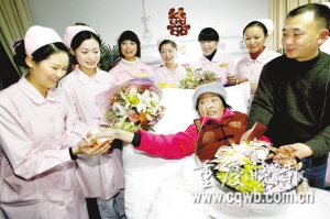 女子叫蔣翠,今年38歲。男人叫張兵,今年44歲。張兵推著妻子,輪椅軋過(guò)紅地毯,迎著空中的花瓣,進(jìn)入病房!白8D銈,你們讓我們懂得了攜手到老的承諾!贬t(yī)生護(hù)士共同祝賀夫妻倆,希望他們“新婚”快樂?粗贾贸尚路康牟》,蔣翠哭出了聲音。“希望你們能堅(jiān)持下去,恩愛永遠(yuǎn)!蔽渚傟(duì)醫(yī)院醫(yī)務(wù)處主任向貴平擔(dān)當(dāng)起了主婚人的職務(wù),向夫妻頒發(fā)了結(jié)婚證。這張結(jié)婚證也傾注了醫(yī)院醫(yī)生護(hù)士的心血。通過(guò)和南岸區(qū)民政局聯(lián)系、溝通,婚姻登記處工作人員特地到病房,為蔣翠辦理了結(jié)婚證。