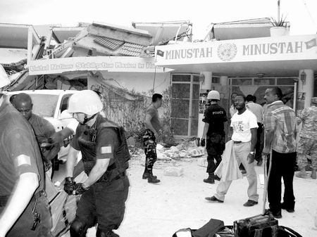 海地時(shí)間1月12日下午4時(shí)50分,太子港發(fā)生地震時(shí),于江樺和在太子港工作的中國同事劉昆開車前往聯(lián)海團(tuán)總部大樓接一位美國同事。車子在大樓前還沒停穩(wěn),大家就覺得車子在晃,一樓已經(jīng)冒出大量白色灰塵并伴隨著轟鳴聲,于江樺和劉昆下車后趕緊向遠(yuǎn)離大樓的地方跑。由于地面在震顫,根本無法站立,倆人只好蹲下等地震停止。大約30秒鐘后,于江樺和劉昆轉(zhuǎn)過頭來,看到聯(lián)海團(tuán)總部大樓已經(jīng)完全坍塌。于江樺連忙掏出手機(jī)撥打隊(duì)長趙化宇的手機(jī),但此時(shí)信號已經(jīng)中斷。這時(shí)防暴隊(duì)長說:“我們的代表團(tuán)正在樓里開會!甭牭竭@個(gè)消息后,于江樺的頭一下子就蒙了。