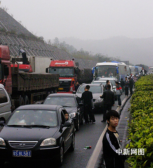記者當(dāng)日16時(shí)30分經(jīng)京珠高速從廣州到韶關(guān),行至清遠(yuǎn)湯塘附近時(shí)發(fā)現(xiàn)交通已經(jīng)堵塞,前方北行高速路上堵滿了大大小小的車輛,一眼望不到頭,被堵的車龍長(zhǎng)達(dá)5公里。此時(shí),雨一直下著,天氣很冷。一些已經(jīng)被堵了近2小時(shí)的乘客一邊吃著食物,一邊焦急等待著。