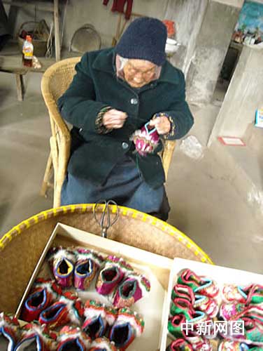中新網(wǎng)鎮(zhèn)江2月11日電 (王致同 鞠永平)江蘇省鎮(zhèn)江市新區(qū)有位99歲的“準(zhǔn)百歲老人”,在喜迎虎年之際,自已用千針萬線繡作一雙雙美麗的“虎頭鞋”,給人間“祈!、“ 祈壽”。