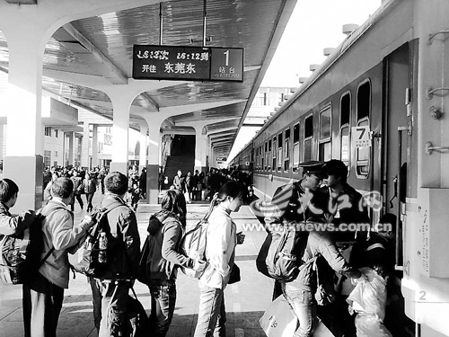 在人擠人的狀態(tài)下,大家都找到了自己的“位置”,或坐或站,走道上,開水房旁……22日6時25分,L613次列車將完成它的首趟運行任務(wù),安全抵達(dá)東莞東。