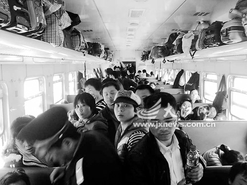 12時40分,記者開始從9號餐車擠向硬座車廂,此時車廂過道上或蹲或站擠滿了人。“該車的實際定員是1684人,但南昌站上車人數(shù)已經(jīng)達(dá)到了2500人,超員48%!绷熊囬L萬軍說,由于全程票價僅67元/張,所以這趟臨客成為農(nóng)民工和學(xué)生眼中的“香餑餑”,全車98%的客流都由他們組成。在這種情況下,記者努力尋覓縫隙,一步一步地艱難挪動著。有時,記者明顯感到踩到了別人的腳上,但也沒有聽到有什么異常反應(yīng)或叫罵。等挪到兩個車廂的接合部時,記者發(fā)現(xiàn)這里才是人口密度最大的地方!白哌^每節(jié)車廂都像踮著腳過河!庇新每痛蛉さ。