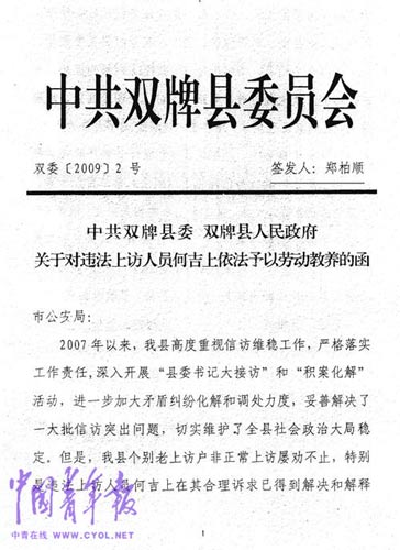 33歲的何守業(yè)至今不敢回家。其父何吉上因舉報(bào)村支書(shū)侵占退耕還林款未見(jiàn)“效果”,多次上告,被認(rèn)定“沖擊國(guó)家機(jī)關(guān)”。在檢察機(jī)關(guān)認(rèn)定其不構(gòu)成犯罪之后,湖南省永州市雙牌縣委書(shū)記鄭柏順簽發(fā)“勞教”文件。2009年8月,永州市“勞教委”決定對(duì)何吉上勞動(dòng)教養(yǎng)一年。