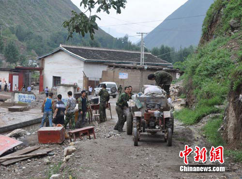 隴南文縣石坊鄉(xiāng)舊關村發(fā)生特大泥石流災害后,該村民兵預備役的民兵們廢寢忘食,幫助受災群眾緊急轉移被雨水浸泡過的糧食。隴南市8月11日晚至12日遭遇了特大暴雨襲擊,截至13日17時,隴南市特大暴雨已致25人遇難,19人失蹤,14.8萬余人受災,86人受傷,成縣黃渚鎮(zhèn)3012人被困,轉移安置一萬余人,6000多人出現(xiàn)飲水困難。