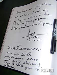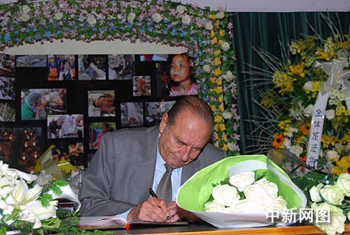 巴黎時(shí)間二十一日上午,法國前總統(tǒng)希拉克專程來到中國駐法國大使館,向中國汶川地震的遇難者表示深切哀悼。希拉克在吊唁簿上寫道:“對(duì)中國遇難者及他們的家屬表示深切的哀悼和慰問,對(duì)偉大的中國人民在此次抗震救災(zāi)中的表現(xiàn)表示欽佩! 作者:吳衛(wèi)中