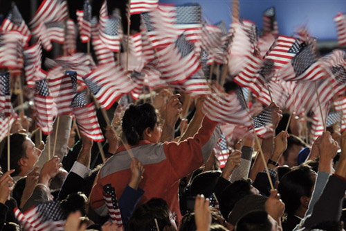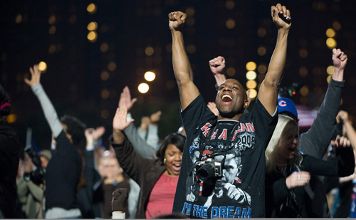 美國總統(tǒng)選舉結(jié)果揭曉,奧巴馬已經(jīng)贏得足夠的選舉人票(270票),取得本屆美國總統(tǒng)大選的勝利。他將成為美國首位黑人總統(tǒng)。圖為支持者慶祝奧巴馬的獲勝