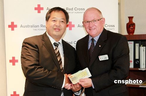 2009年2月19日,西澳福建同鄉(xiāng)會(huì)潘邦照會(huì)長代表西澳華人向澳大利亞紅十字會(huì)交接澳洲華人社區(qū)為澳大利亞維多利亞火災(zāi)募集的第一筆捐款共四萬七千七百七十七澳幣(折人民幣22萬元)。澳大利亞紅十字會(huì)執(zhí)行理事Steve Joske代表紅十字會(huì)接受捐款并對(duì)澳洲華人們的善舉給予高度贊揚(yáng)。中新社發(fā) 高周丹 攝
