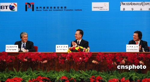 十一月二十八日,第四屆中歐工商峰會在北京人民大會堂閉幕。中國國務院總理溫家寶、歐盟輪值主席國葡萄牙總理蘇格拉底(左)與歐盟委員會主席巴羅佐(右)共同出席閉幕式。中新社發(fā) 廖文靜 攝
