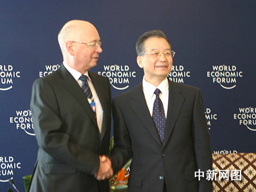 當(dāng)?shù)貢r(shí)間一月二十八日中午,中國(guó)總理溫家寶在瑞士達(dá)沃斯會(huì)見世界經(jīng)濟(jì)論壇主席施瓦布(左)。施瓦布對(duì)溫家寶出席本次論壇年會(huì)表示熱烈歡迎。張朔 攝