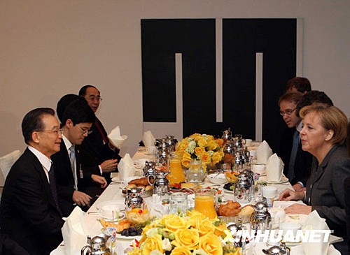 1月29日,正在德國(guó)進(jìn)行正式訪問(wèn)的中國(guó)國(guó)務(wù)院總理溫家寶,應(yīng)邀在柏林德國(guó)總理府與德國(guó)總理默克爾共進(jìn)早餐。蘭紅光 攝