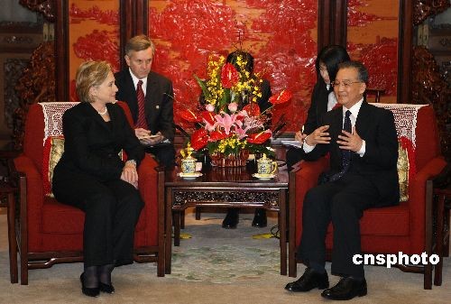 2月21日下午,中國(guó)國(guó)務(wù)院總理溫家寶在北京中南海紫光閣會(huì)見美國(guó)新任國(guó)務(wù)卿希拉里·克林頓。溫家寶在會(huì)見中引用《孫子兵法》中“同舟共濟(jì)”的成語(yǔ),比喻中美兩國(guó)關(guān)系。中新社發(fā) 任晨鳴 攝