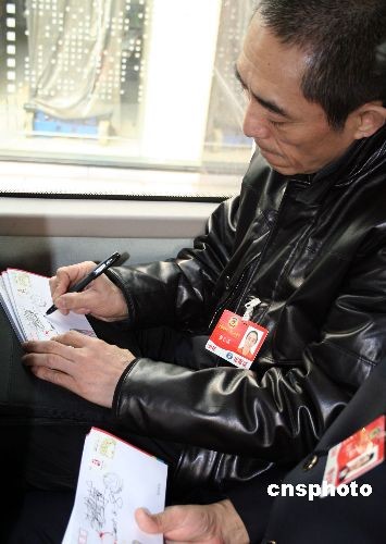3月3日下午,在前往全國(guó)政協(xié)十一屆二次會(huì)議開幕式現(xiàn)場(chǎng)的大巴上,導(dǎo)演張藝謀忙著為眾人簽奧運(yùn)首日封。中新社發(fā) 應(yīng)妮 攝