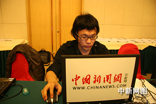 3月6日下午,出席十一屆全國(guó)人大二次會(huì)議的5位企業(yè)家代表在大會(huì)新聞中心(梅地亞中心多功能廳)就“企業(yè)如何應(yīng)對(duì)國(guó)際金融危機(jī)的挑戰(zhàn)”接受中外記者的采訪。圖為本網(wǎng)記者在現(xiàn)場(chǎng)進(jìn)行直播。中新網(wǎng)記者 唐偉杰 攝