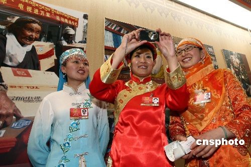 3月8日,參加全國(guó)人大的甘肅團(tuán)代表參觀在北京民族宮舉辦的西藏民主改革50年大型展覽。保安族馬曉琴代表(左)、東鄉(xiāng)族馬含嵐代表(中)、回族畢紅珍代表在展覽現(xiàn)場(chǎng)用相機(jī)留下珍貴紀(jì)念。中新社發(fā) 杜洋 攝