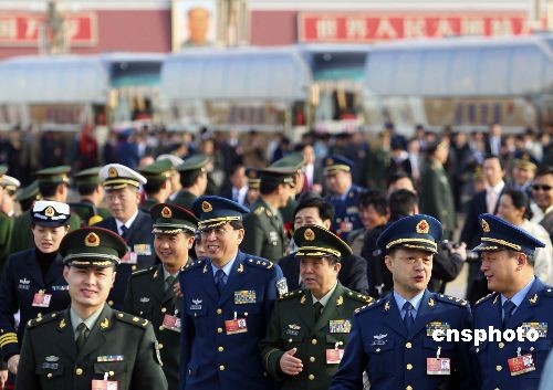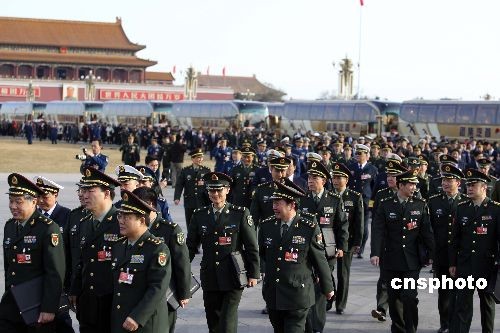 3月9日,十一屆全國(guó)人大二次會(huì)議在北京人民大會(huì)堂舉行第二次全體會(huì)議,解放軍代表團(tuán)步入會(huì)場(chǎng)。中新社發(fā) 盛佳鵬 攝