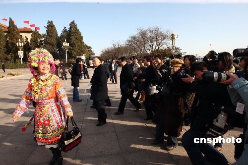 3月9日,十一屆全國人大二次會(huì)議在人民大會(huì)堂舉行第二次全體會(huì)議,穿著亮麗民族服飾的女代表成為攝影記者追逐的對象。中新社發(fā) 杜洋 攝