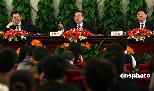 3月10日,十一屆全國(guó)人大二次會(huì)議在人民大會(huì)堂舉行記者會(huì),工業(yè)和信息化部部長(zhǎng)李毅中(中)、人力資源和社會(huì)保障部部長(zhǎng)尹蔚民(右)、商務(wù)部部長(zhǎng)陳德銘(左)就“擴(kuò)內(nèi)需、促就業(yè)、保增長(zhǎng)”答記者問(wèn)。中新社發(fā) 杜洋 攝