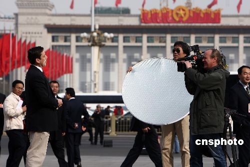 3月10日,外國媒體在北京人民大會堂前現(xiàn)場報道兩會。當(dāng)日,十一屆全國人大二次會議在人民大會堂舉行第三次全體大會,最高人民法院院長王勝俊、最高人民檢察院檢察長曹建明分別作工作報告。中新社發(fā) 杜洋 攝