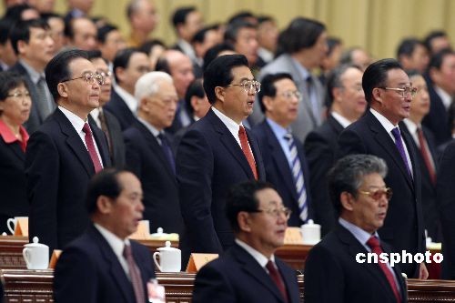 3月12日,全國政協(xié)十一屆二次會議舉行閉幕大會,胡錦濤、吳邦國、溫家寶等黨和國家領(lǐng)導(dǎo)人在閉幕式上唱國歌。中新社發(fā) 盛佳鵬 攝