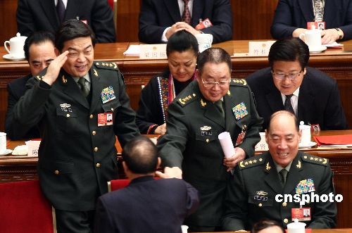 3月13日,第十一屆全國(guó)人民代表大會(huì)第二次會(huì)議在人民大會(huì)堂舉行閉幕會(huì),解放軍代表在主席臺(tái)上互致問(wèn)候。中新社發(fā) 杜洋 攝