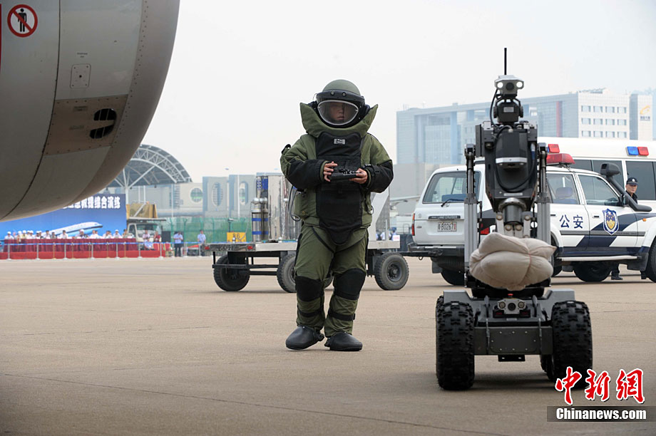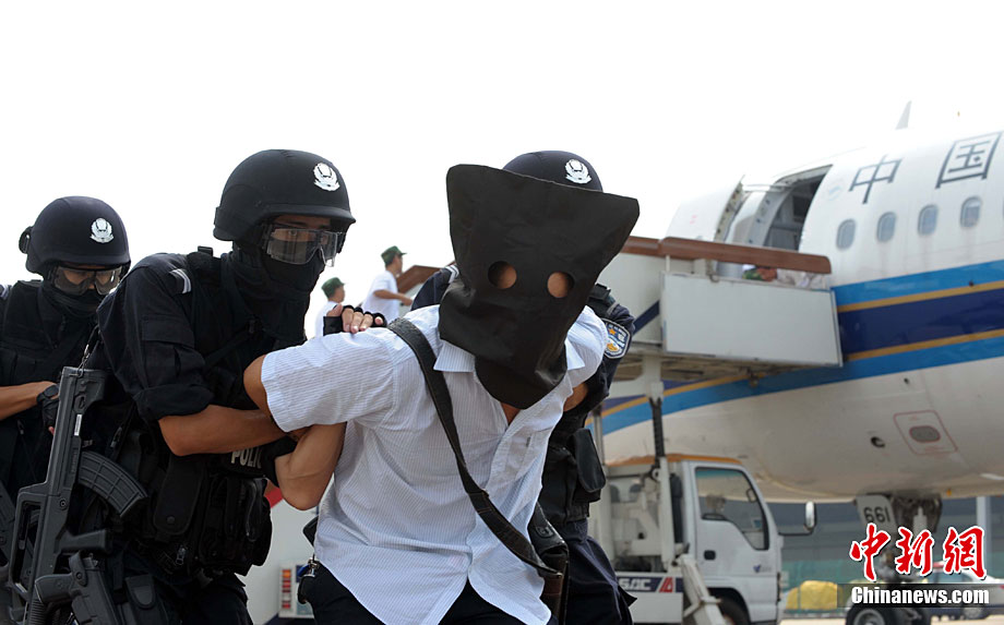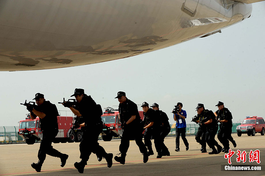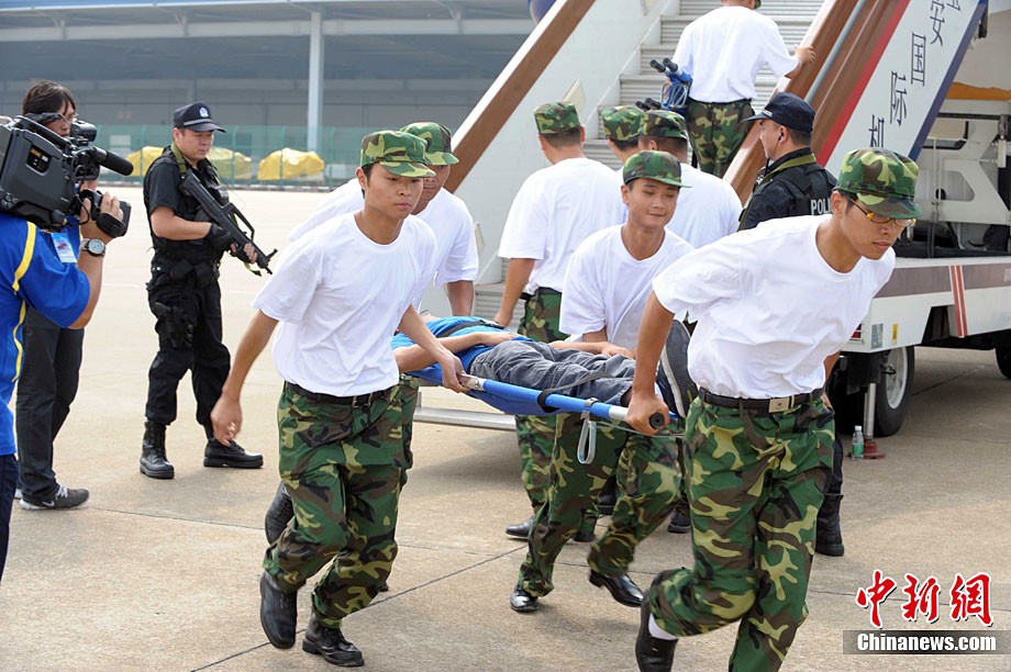 9月16日,深圳寶安國際機(jī)場舉行反恐應(yīng)急演習(xí),模擬一架客機(jī)被歹徒劫持后,特警、防爆、消防、醫(yī)療救護(hù)等各方面展開營救,在短時間內(nèi)解救人質(zhì)處理事故。中新社記者 陳文 攝