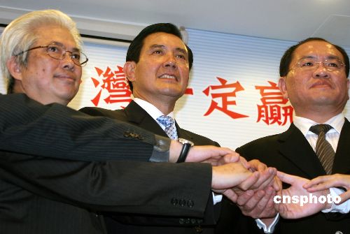 圖為馬英九(中)與其辯護(hù)律師將手緊緊搭在一起。