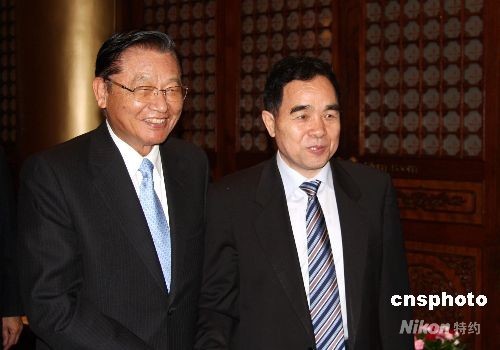 9月19日,臺灣;鶗(huì)董事長江丙坤在臺北圓山飯店,會(huì)見率團(tuán)前來臺灣參加海峽兩岸出版交流二十周年紀(jì)念活動(dòng)的部分大陸代表團(tuán)成員時(shí),與新聞出版署署長柳斌杰(右)在一起。中新社發(fā) 陳立宇 攝