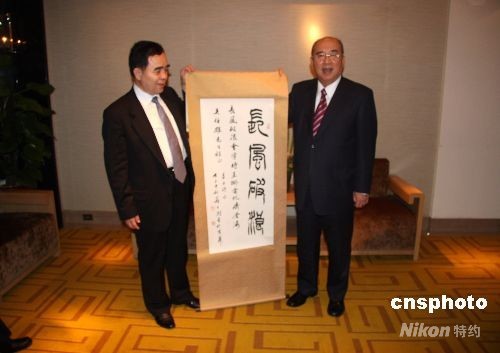 圖為柳斌杰向吳伯雄贈送“長風(fēng)破浪”的書法條幅。