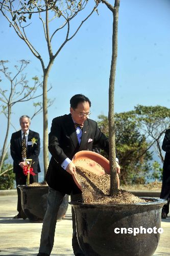 一月五日,香港科技大學(xué)與普林斯頓大學(xué)高等研究院簽訂協(xié)議,合作成立科大高等研究院,香港特首曾蔭權(quán)特到場植樹紀念。中新社發(fā) 譚達明 攝