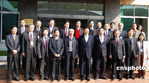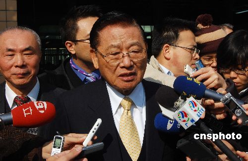 一月九日上午,海協(xié)會(huì)與海基會(huì)聯(lián)合參訪團(tuán)在廣州考察一家臺(tái)資企業(yè)?疾旖Y(jié)束后,臺(tái)灣;鶗(huì)董事長(zhǎng)江丙坤接受兩岸記者聯(lián)合采訪。中新社發(fā) 柯小軍 攝