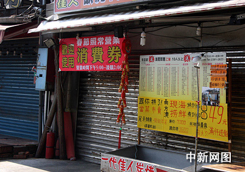 臺(tái)灣18日發(fā)放消費(fèi)券,看來(lái)很受歡迎。圖為臺(tái)北市新生南路一家飯館,下午五時(shí)才營(yíng)業(yè),但今天早上已掛出歡迎使用消費(fèi)券招牌。陳立宇 攝