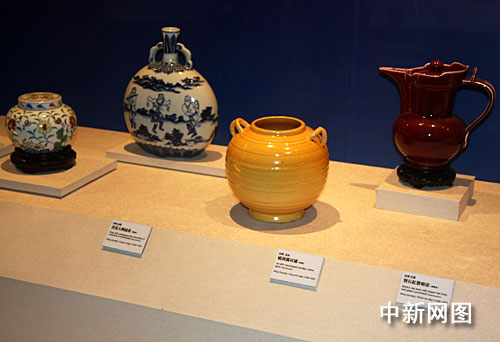 近日,為推廣臺北故宮“周末夜”活動,臺北故宮博物院在臺北火車站設(shè)置長箱型玻璃廣告廊,以高仿真度的館藏文物進(jìn)行宣介。圖為展示的仿明代前期官營作坊的瓷器。 中新社記者 陳立宇 攝