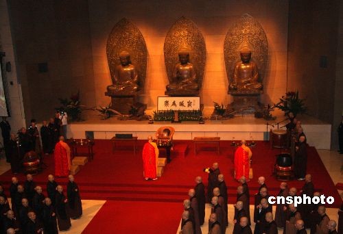 2月15日,臺(tái)灣法鼓山創(chuàng)辦人圣嚴(yán)法師追思法會(huì)暨植存在法鼓山舉行。圖為圣嚴(yán)法師生前摯友今能、寬裕及廣慈三位主法長(zhǎng)老在世界佛教教育園區(qū)大殿唱誦心經(jīng),送圣嚴(yán)法師最后一程。中新社發(fā) 陳立宇 攝