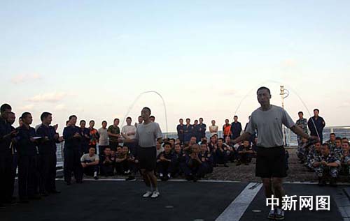 中新網(wǎng)“?凇迸1月10日電 當(dāng)?shù)貢r(shí)間1月10日下午,正在亞丁灣海域執(zhí)行護(hù)航任務(wù)的“海口”號(hào)導(dǎo)彈驅(qū)逐艦繼續(xù)舉行甲板運(yùn)動(dòng)會(huì),參賽官兵參加跳繩項(xiàng)目比賽。