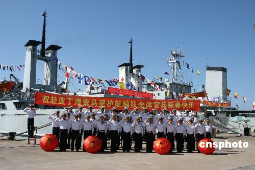春節(jié)前夕(1月21日),遠赴亞丁灣執(zhí)行護航任務的“微山湖”艦所在的南海艦隊某勤務船大隊官兵,打出橫幅,祝福全體護航官兵新春快樂,向他們拜早年,并向他們致以崇高的軍禮。中新社發(fā) 劉林 攝