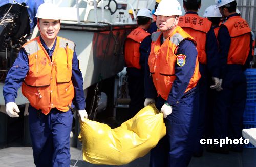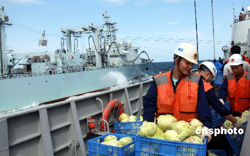 春節(jié)前夕,中國海軍艦艇編隊“?凇碧枌楎(qū)逐艦與“微山湖”號綜合補給艦完成一次海上補給,圖為“?凇迸灩俦徇\補給到艦上的“年貨”。中新社發(fā) 孫自法 攝