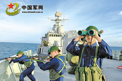 圖:“廣州”號導彈驅(qū)逐艦進行反海盜演練